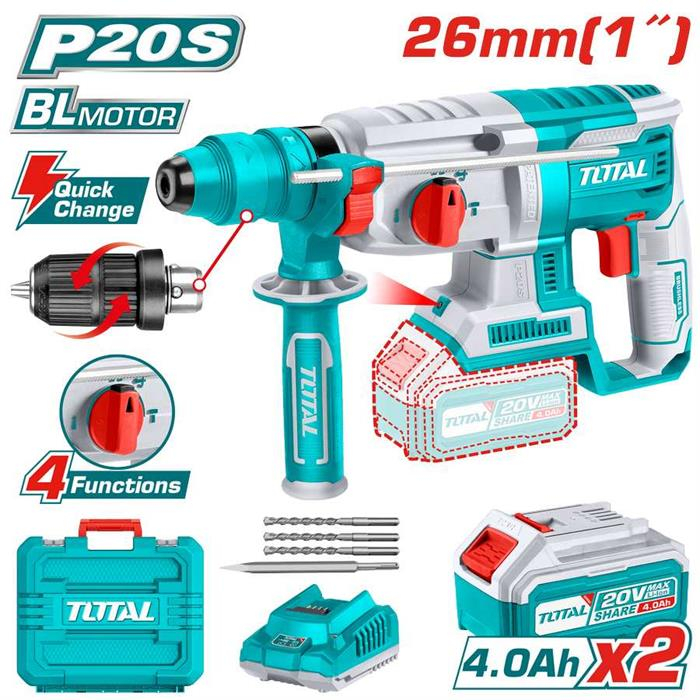 TOTAL MARTELLO TASSELLA. DEMOLI.SDS PLUS BRUSHLESS S/ SPAZZOLE 20V - FORZA 2.5 JOULE CON 2 BATTE. 4 AH + 3 PUNTE + SCALPELLO + MANDRI.AUTOSERRA.CORDELESS ROTARY HAMMER TRHLI202289 ULTIMI PEZZI ;§